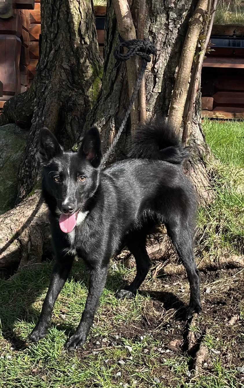 Tillitsfull og fin mix Svart Elghund / Border Collie / Finsk Lapphund hann 3,5 år trenger nytt hjem pga eiers sykdom og tidsmangel. Vant med barn, liker bilkjøring, liker katter, vant til å være i hundegård på dagtid. Helseattest og vaksine ok. Omplassert til par i Bergen 21/9-25