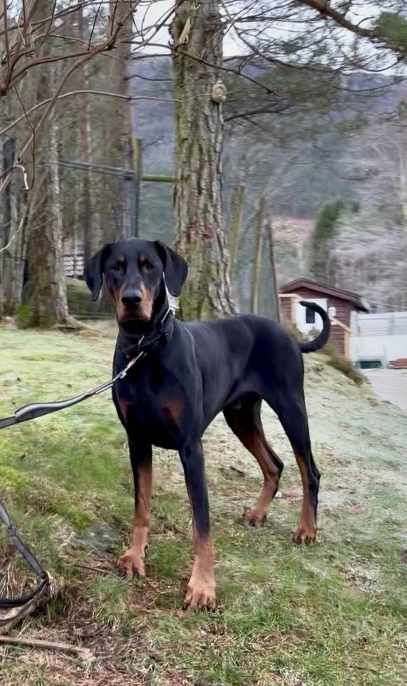 Grei Dobermann hann 5 år m/NKK registrering trenger nytt hjem pga flytting/tidsmangel. Redd barn, vant til å være hjemme på dagtid. Liker bilkjøring, jager katter. Helseattest, vaksine og chip ok. Omplassert til mann på Jærpeland 27(12-25