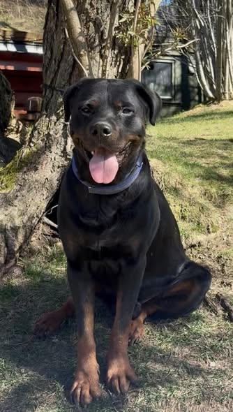 Trivelig Rottweiler hann 7år u/papir, trenger nytt hjem pga eiers stadig dårligere helse. Trenger fast og konsekvent hånd, men har bra lydighet og godt gemytt. Ikke særlig vant til barn, men glad. Liker bilkjøring, nyskjerrig på katter. Vert lite alene pga eier er ufør, men godtar å være noen timer alene, når eier er ute. Helseattest og vaksine OK. Har HD men er spretten, sterk og aktiv. Gebyr 5000.-